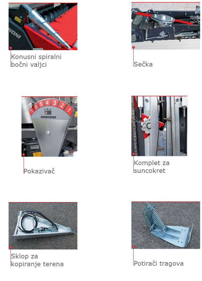 KONUSNI SPIRALNI BOČNI VALJCI (1) neiziostavna su oprema za ubiranje kukuruza koji je polegao i upleten. SEČKA (2) velikog je prečnika i male potrošnje snage. Postavljena je tik ispod otkidačkih valjka i omogućava potpuno usitnjavanje biljnih ostataka zbog velike brzine okretanja. Jednostavno se isključuje, (svaka za sebe), nezavisno od samog pogonskog uređaja za ubiranjue. POKAZIVAČ (3) razmaka otkidačkih ploča omogućava nam uvid u razmak između ploča. KOMPLET ZA SUNCOKRET (4) jednostavan i lak za montažu. SKLOP ZA KOPIRANJE TERENA (5) omogućava automatsko podešavanje visine kukuruznog hedera od tla. POTIRAČI TRAGOVA (6) se postavljaju radi izbegavanja oštećenja na gumama od oštrih odsečenih stabljika kukuruza. |